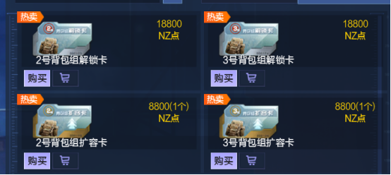 扩容卡:在一号背包组全部六个背包解锁的情况下可购买,依次解锁后三个背包,每购买一张解锁一个背包。