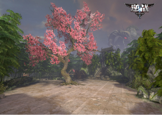 场景来源于猎场地图九州龙陵,硕大的樱花树开满了粉红色的樱花搭配上周边绿油油的树林是不是恰到好处呢?而樱花树下却暗藏着巨大的危险,通过樱花树就可以到达BOSS阴阳天师关卡了。