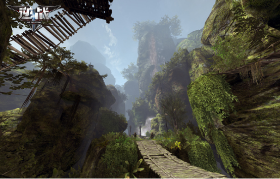 场景来源于猎场地图九州龙陵,宏伟的盘龙山中的这座木桥是游戏中玩家的必经之路,依山傍水显得它格外的美丽。