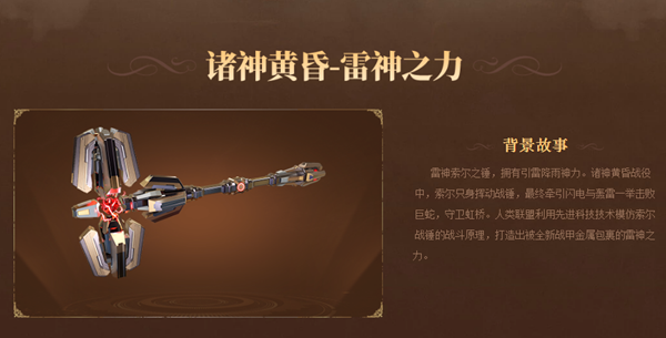 ? ? ? ?雷神索尔之锤,拥有引雷降雨神力。诸神黄昏战役中,索尔只身挥动战锤,最终牵引闪电与轰雷一举击败巨蛇,守卫虹桥。人类联盟利用先进科技技术模仿索尔战锤的战斗原理,打造出被全新战甲金属包裹的雷神之力。