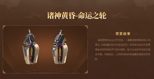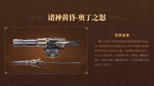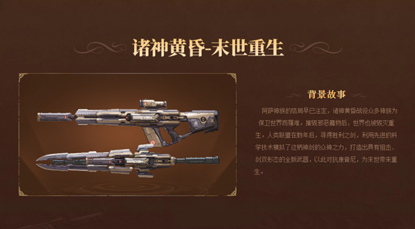 ? ? ? ?诸神黄昏主武器拥有三种形态,初始形态为末世重生。诸神黄昏战役众多神族为保卫世界而罹难,阿萨神族首当其冲,摧毁邪恶魔物后,世界也被毁灭重生,人类联盟在数年后,寻得胜利之剑,利用先进的科学技术模拟了这柄神剑的众神之力,打造出具有狙击、剑双形态的全新武器,以此对抗康普尼,为末世带来重生。