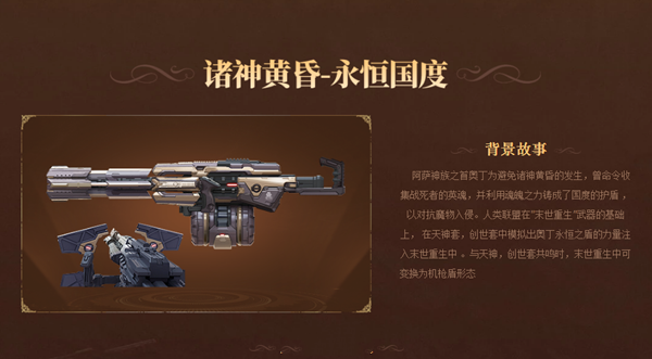 ? ? ? ?阿萨神族之首奥丁为避免诸神黄昏的发生,曾命令收集战死者的英魂,并利用魂魄之力铸成了国度的护盾 ,以对抗魔物入侵。人类联盟在"末世重生”武器的基础上, 在天神套,创世套中模拟出奥丁永恒之盾的力量注入末世重生中 。与天神,创世套共鸣时,末世重生中可变换为机枪盾形态。